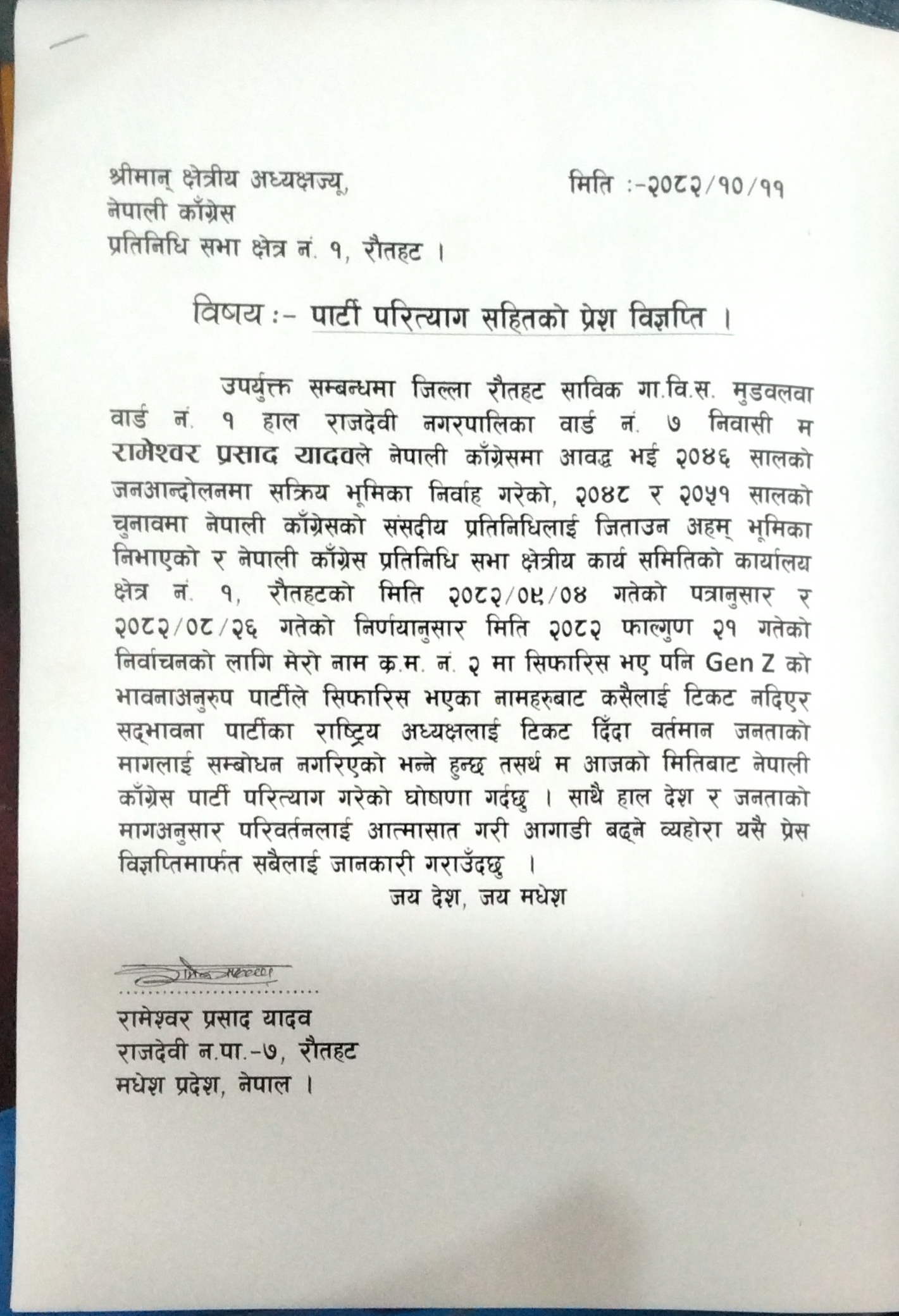 जेन–जी को भावना अनुरुप क्षेत्रिय समितिले सिफारिस गरेपनि पार्टी हाइकमानले अन्य पार्टीबाट आएका व्यक्तिलाई निर्वाचनमा उम्मेदवार बनाएको आरोप लगाउदै रामेश्वर प्रसाद यादवले नेपाली काँग्रेस पार्टी परित्यागको घोषणा गरेका छन् ।